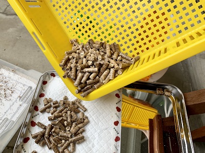 かごを振ると、細かいものが落ちて綺麗なペレットだけ残ります。