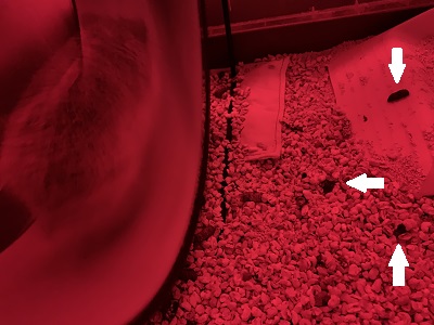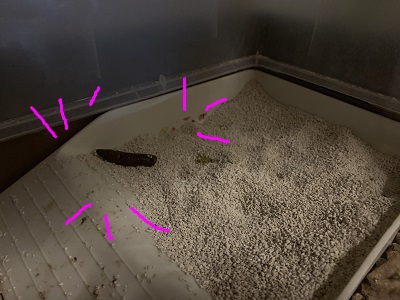 小さいコロコロ (3本分位?、回し車の下) 踏んで固まったのか判断つかず。