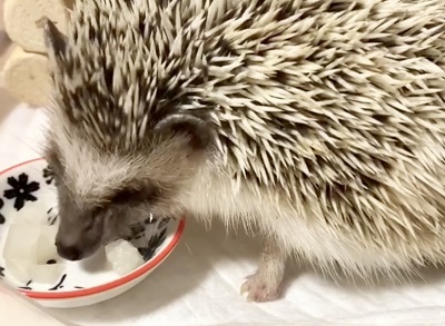 ハリネズミの満福丸に、人生2度目の梨を与えました。